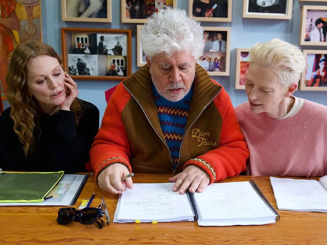 影片中的对白保持了遣词造句与日常生活的平衡,红色在阿莫多瓦的调色板中一如既往地突出。两位女主角的服装搭配也十分协调,就连医院的设计也充满了阿莫多瓦的独特风格。斯文顿饰演的玛莎首次出现在病房里时,面色苍白,消瘦憔悴,但即便如此,她依然保持着一种坚定和勇敢的态度。与此同时,阿莫多瓦毫不畏惧地赞美那些看似习以为常或平淡无奇的事物:降雪的景色、鸟鸣的声音、躺在躺椅上享受暮春阳光的乐趣。这些细节让影片充满了诗意和温暖。